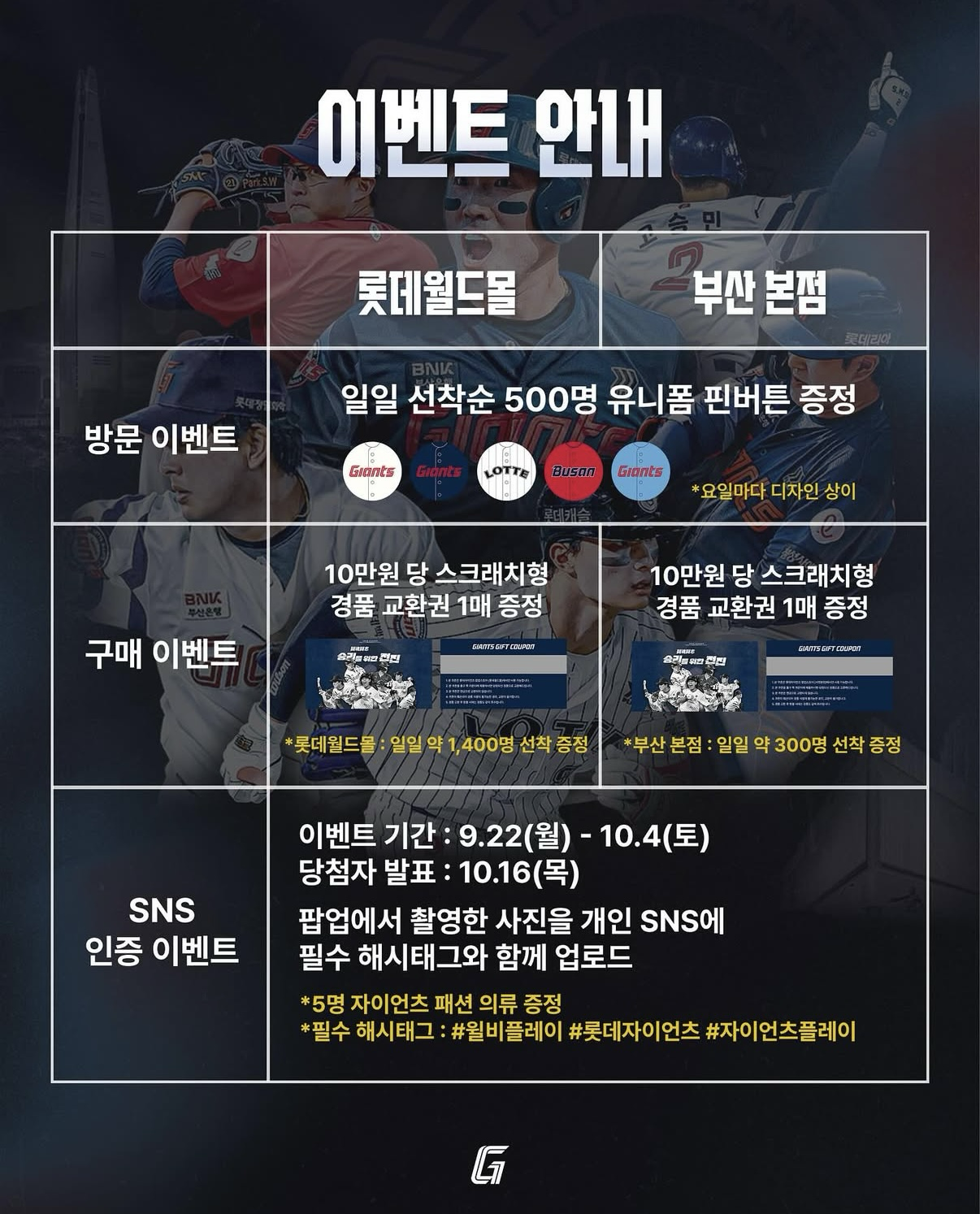 - 인스타그램 @giants.play 태그 후 인증샷 업로드 시 추첨을 통해 특별 굿즈 증정